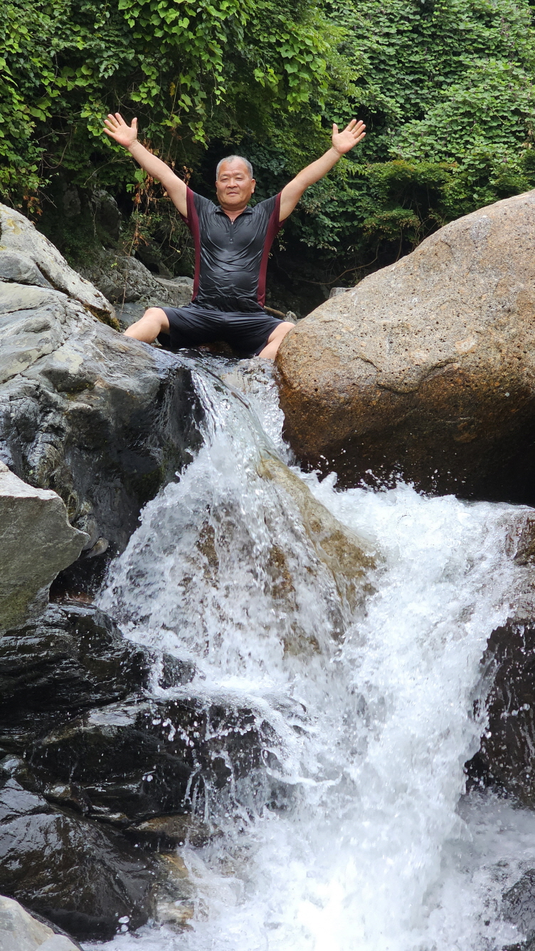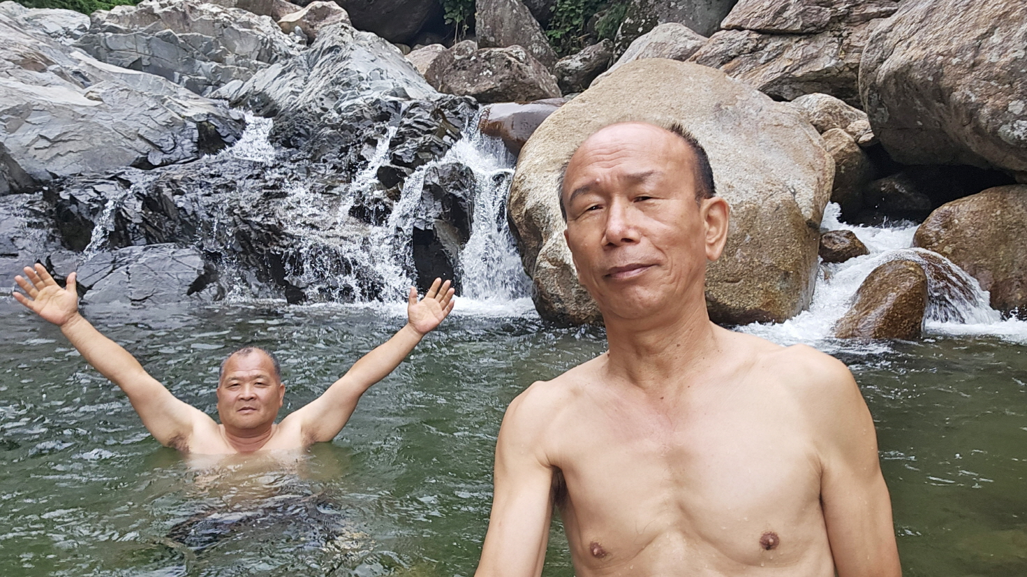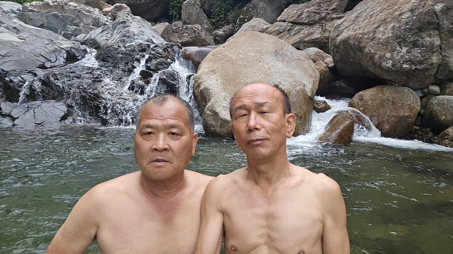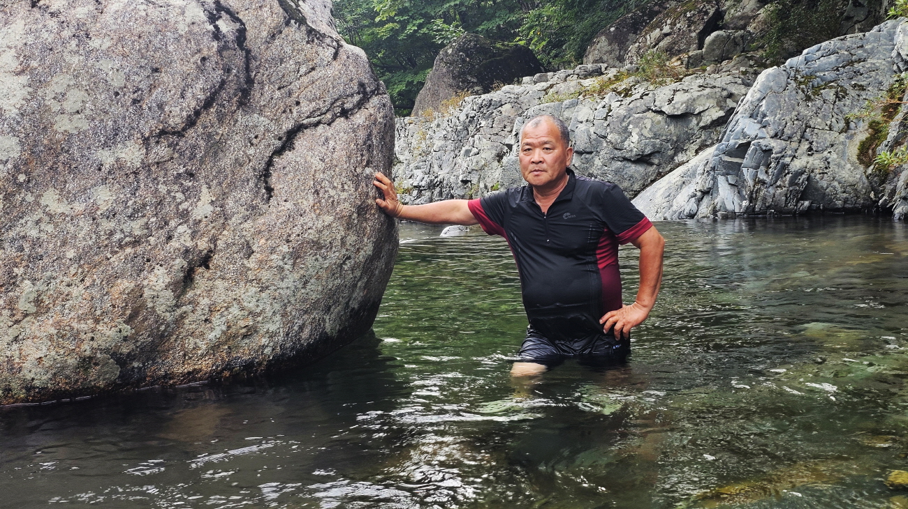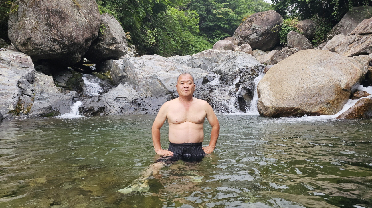 상의를 탈의하고 계곡에 몸을 맡겨본다