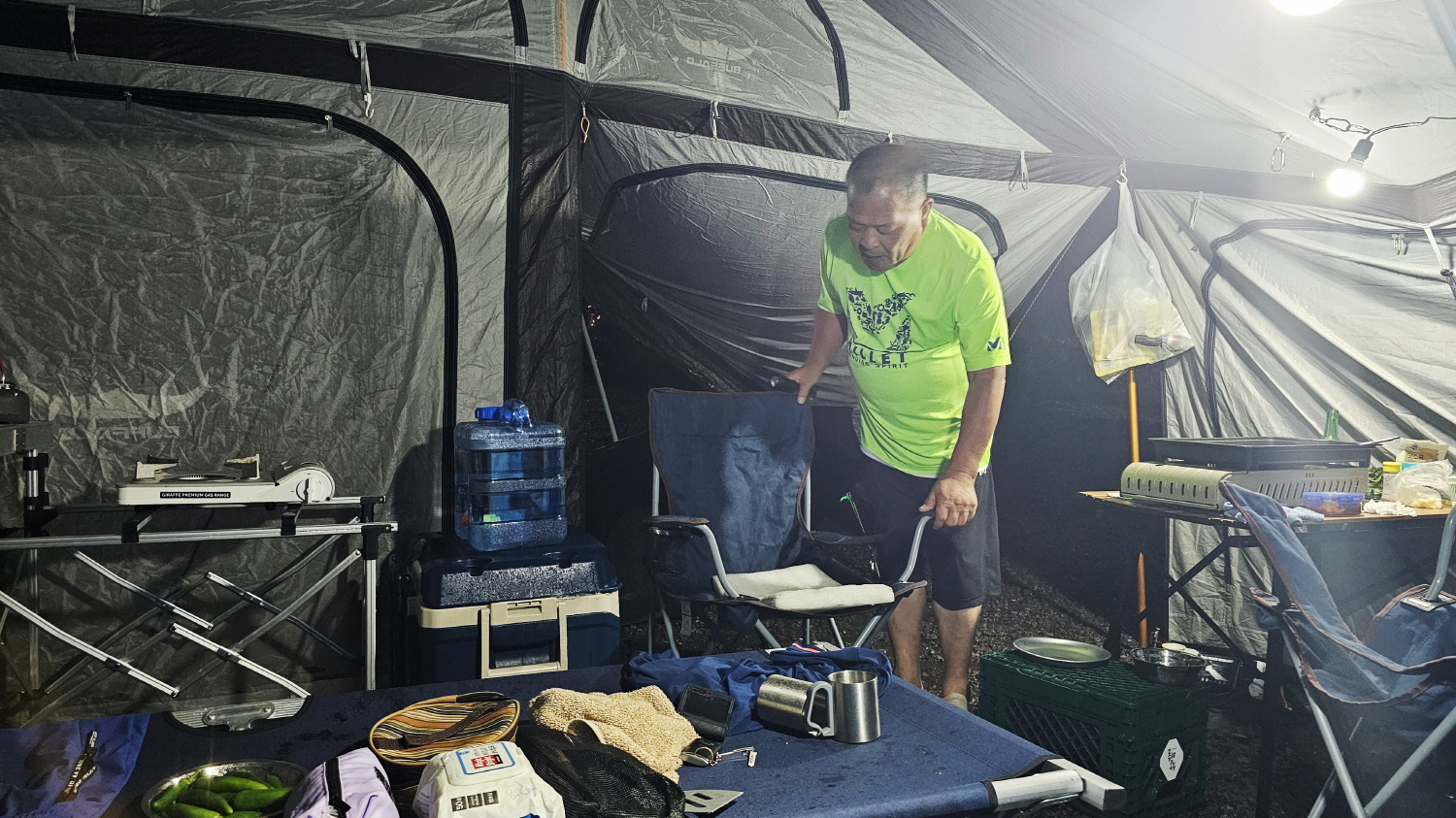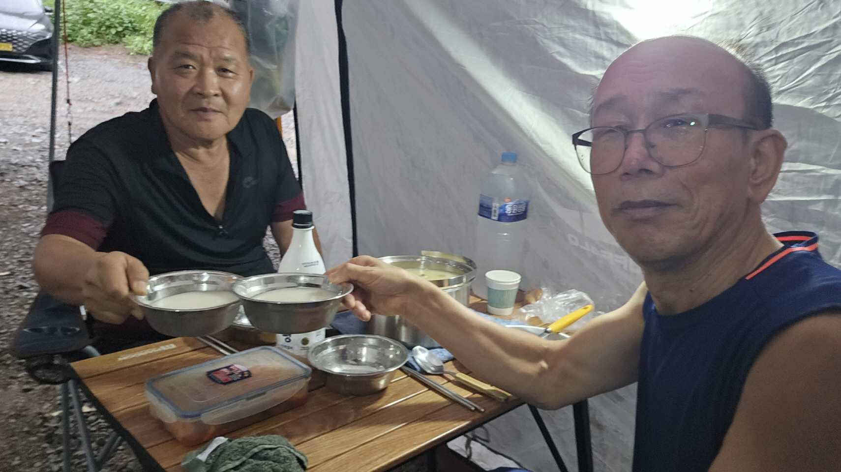 텐트 위에 물이 고여 옷을 홀딱 버리면서 복구작업을 마치고