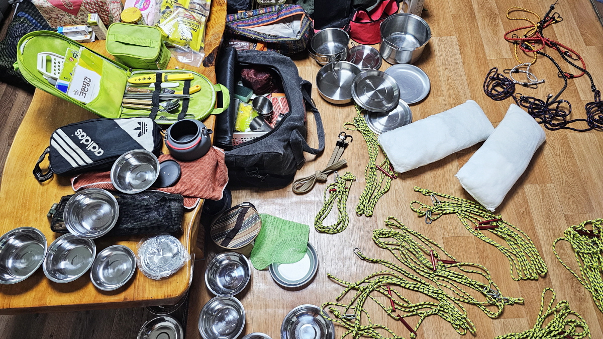 결국 혼자 장비와 밤새내린 폭우에 흙탕물이 튄 텐트를 담벼락에 걸쳐 놓고 물로 씻어내고 밤 9시 까지 뒤적이면서 말리고 그 외의 장비는 모두 거실 바닥에 씻어 펼쳐놓고 말리는 중이다
