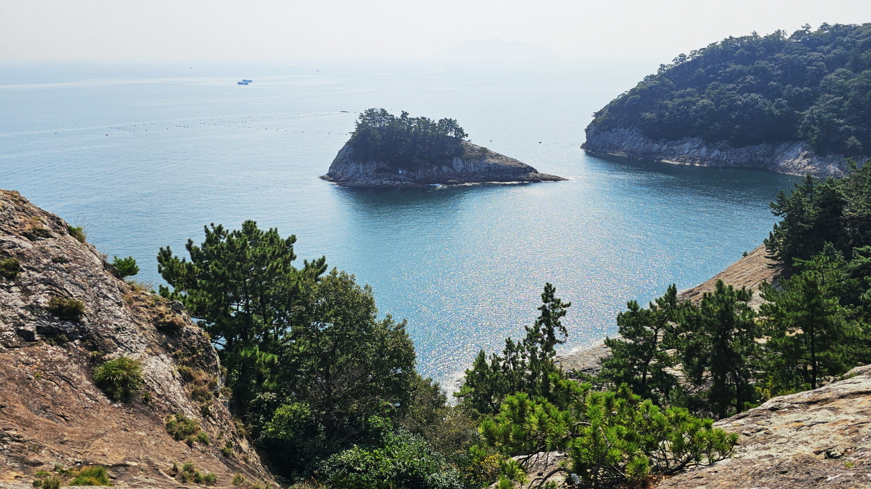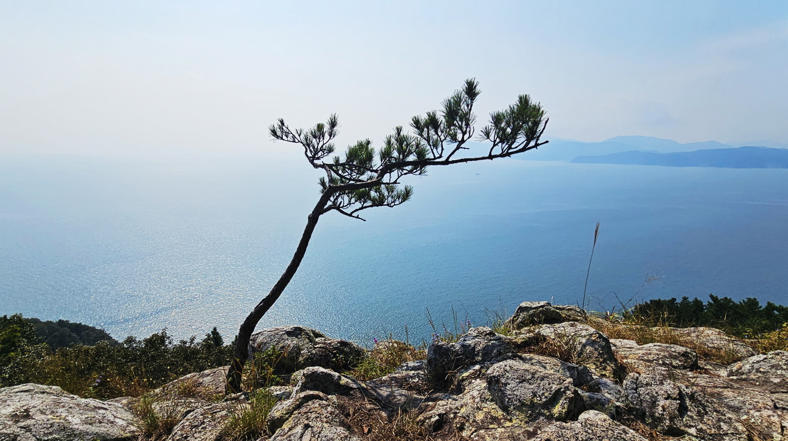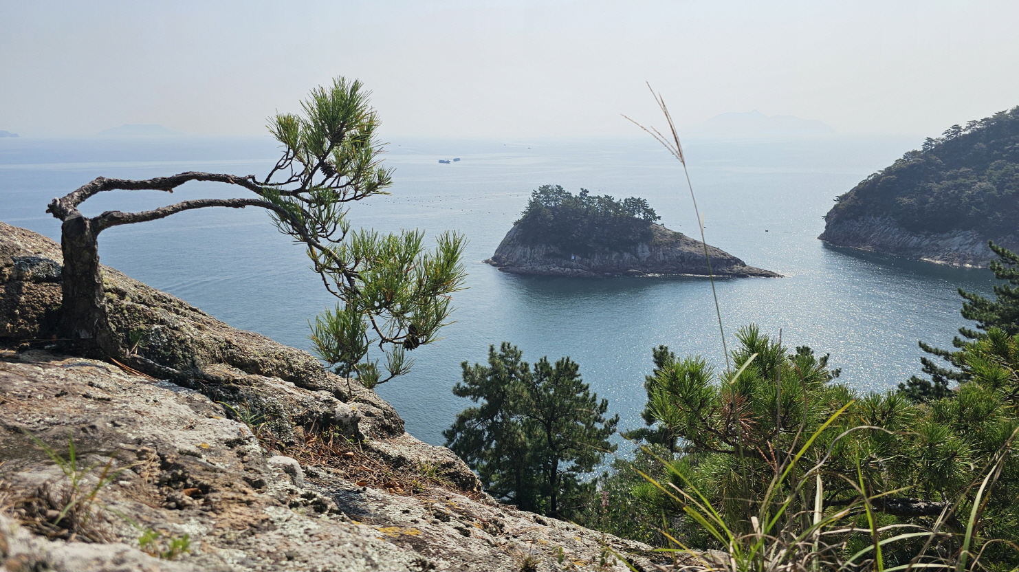 해풍을 이겨내고 멋지게 자라는 소나무, 섬 그리고 억새풀 하나와 멀리 보이는 고깃배는 수우도의 포토죤이다
