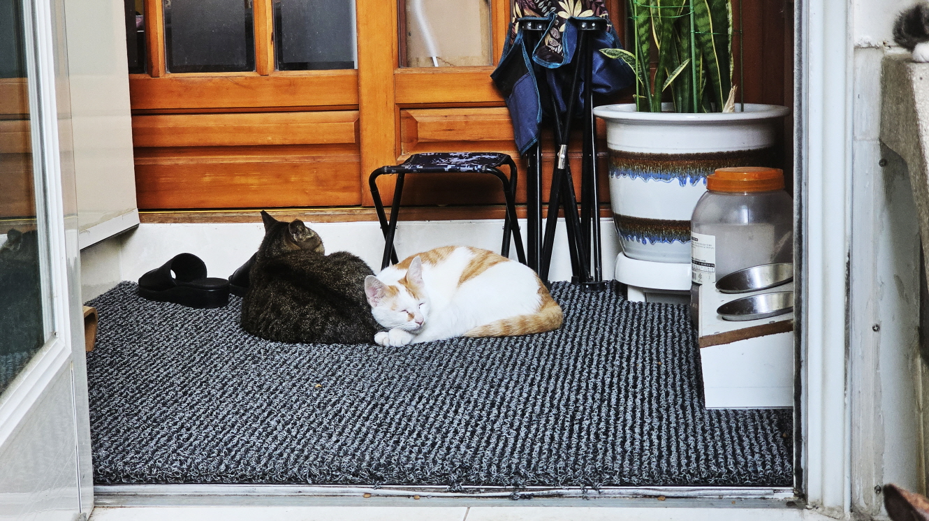 우측에 있는 달이는 2025년 6월 25일에 아주 작은 쌔끼냥이가 똘이와 화단에서 놀고 있는 것을 발견하고 그때부터 우리 집에 정착하게 되었음