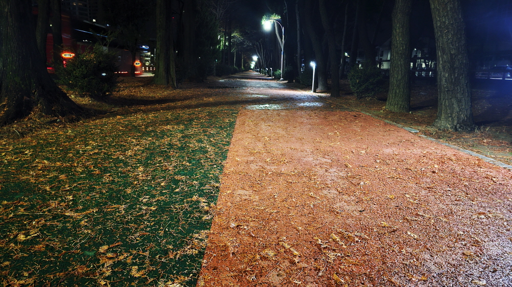 새벽 5시 50분에 집을 나서서 승차지인 시티세븐몰 앞까지 걸어가는데 새벽녘에 잠시 내린 비로 낙엽이 발길을 멈추게 했다