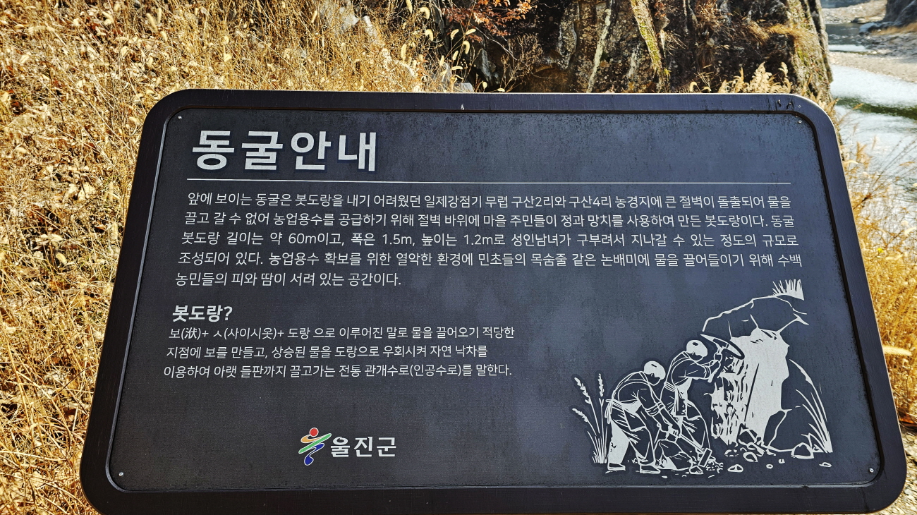 절벽을 뚫어 물길을 만들기 위해 일제강점기에 주민들의 노동으로 만들었다는 60m 길이의 수로에 선조들의 힘들었던 고통을 함께 기억해 봅니다