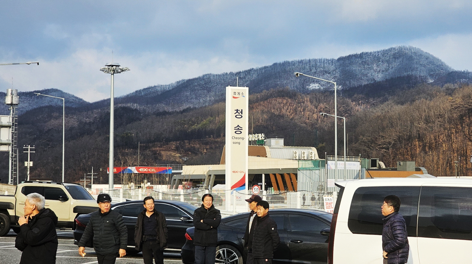 먼 산에 흰눈이 내린 청송휴게소에 들렀다