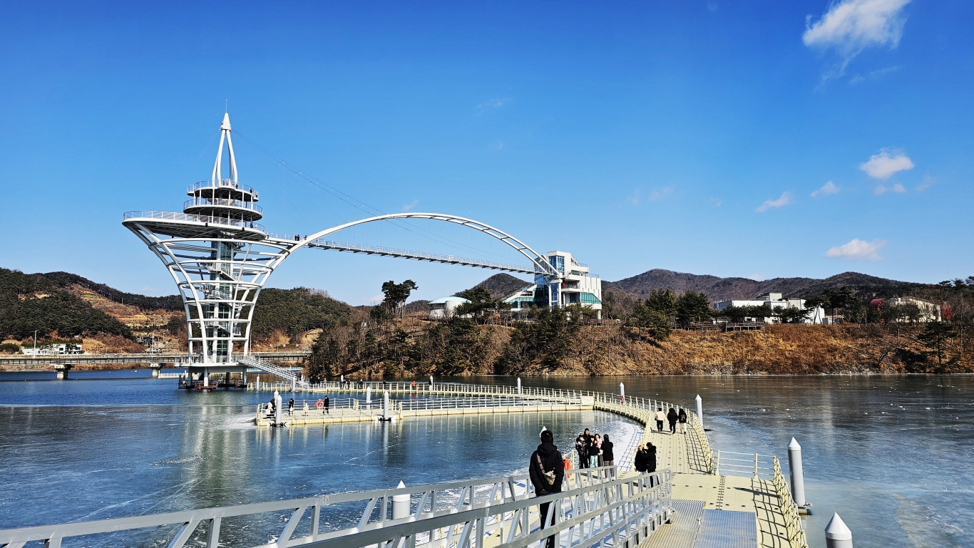 스카이워크에서 승강기를 타고 1층으로 내려와 저수지에 놓인 부교를 따라 건너는 묘미도 괜찮다